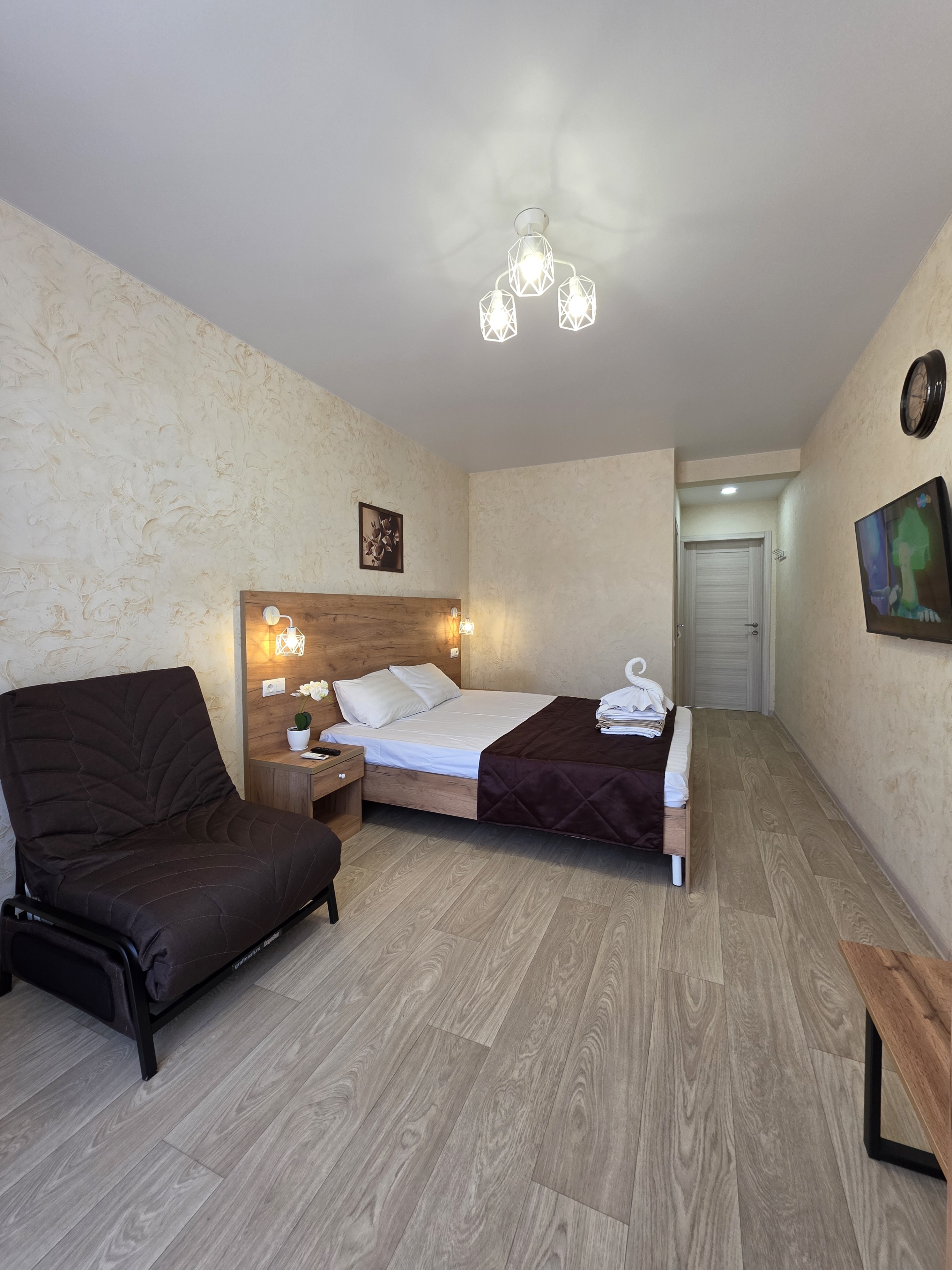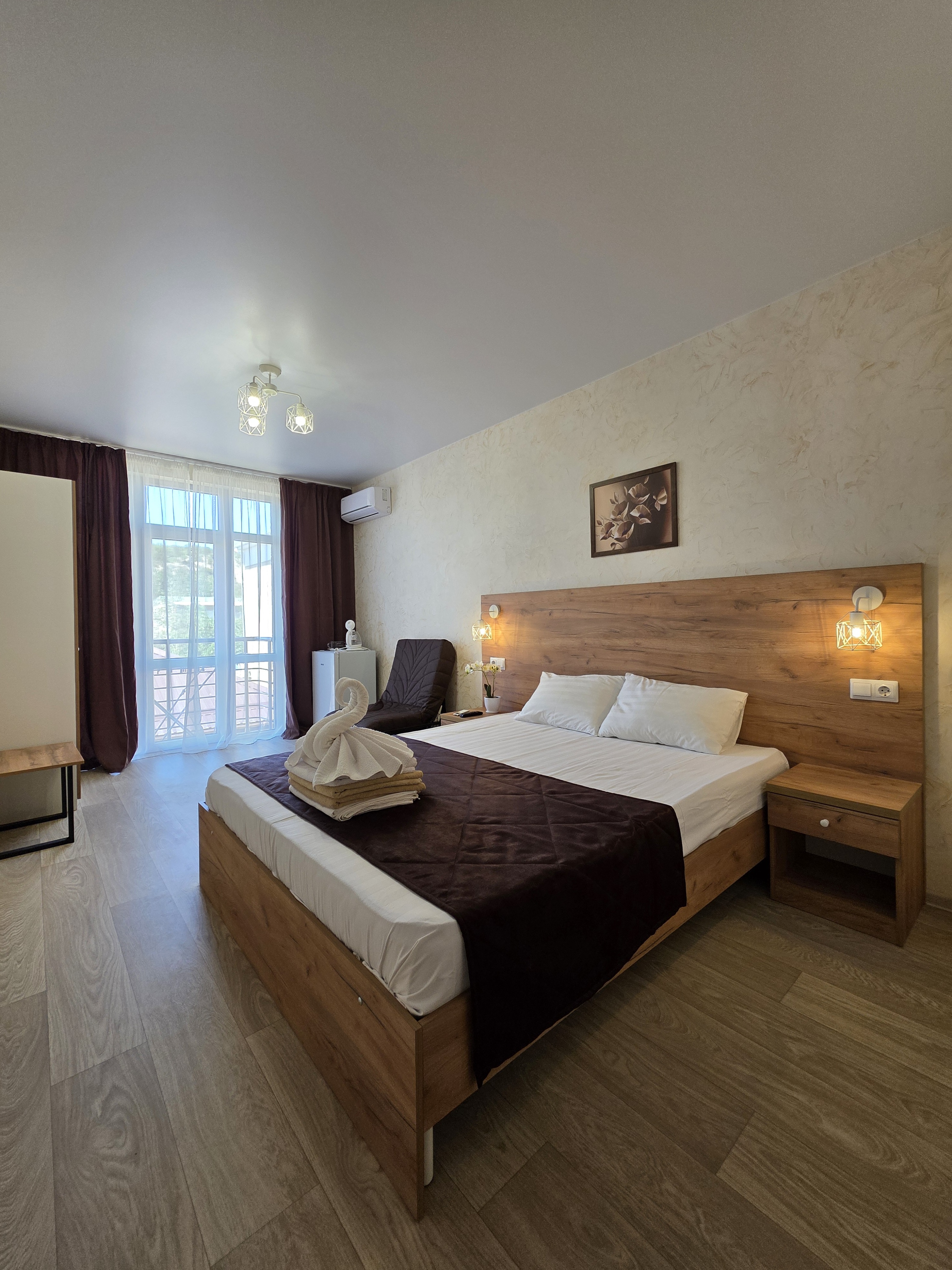В номере одна двуспальная кровать + кресло-кровать, тумбочки, шкаф, телевизор, холодильник, сплит-система, санузел, фен, wi-fi